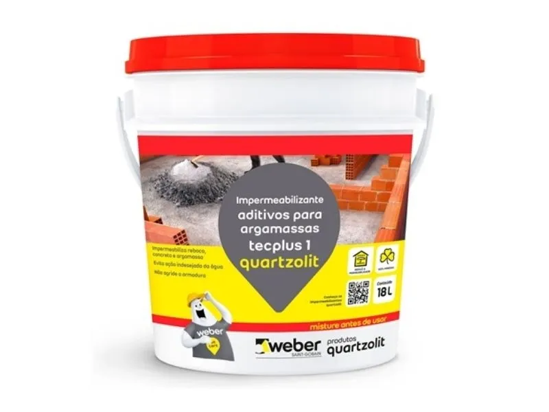 Tecplus 1 Quartzolit é um aditivo líquido impermeabilizante para concreto e argamassa, quando é adicionado à água de amassamento proporciona a redução da permeabilidade para evitar a umidade e infiltração d’água na argamassa. Aumenta a coesão das argamassas, para melhor trabalhabilidade. Pode ser aplicado concretos e argamassas em elementos que estejam expostos à umidade e à pressão da água. Fácil adição a argamassas e concretos. Maior garantia e durabilidade da obra. Amplo uso na construção civil. Isento de cloretos que agridem a armadura da estrutura. Aditivo para impermeabilização de argamassas de areia e cimento e concretos. Ganho de coesão e trabalhabilidade nas argamassas. Isento de cloretos que agridem a armadura da estrutura. Contra-indicações. Gesso ou argamassa de gesso. Misturas onde o aglutinante não seja cimento Portland.